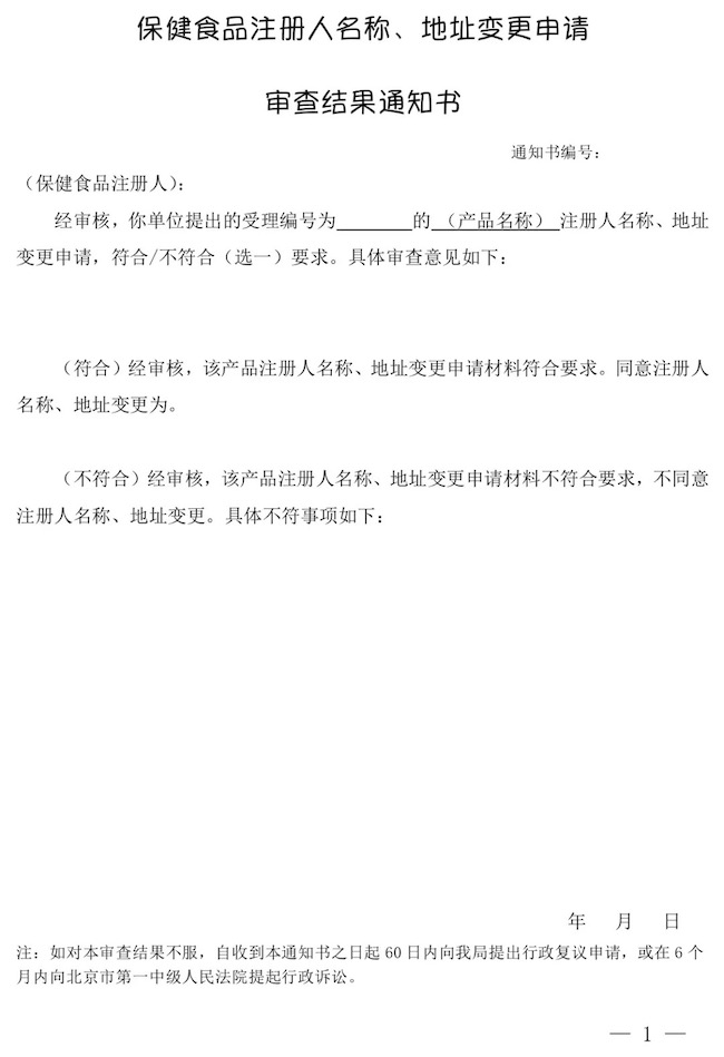 二、變更前持有證書為依據(jù)原注冊(cè)規(guī)章批準(zhǔn)的,發(fā)放《保健食品注冊(cè)人名稱、地址變更申請(qǐng)審查結(jié)果通知書》(見附件),與原批準(zhǔn)證明文件合并使用。