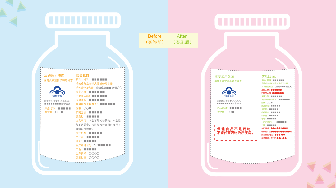 保健食品標簽設置警示用語區(qū)及警示用語。警示用語區(qū)位于最小銷售包裝包裝物(容器)的主要展示版面,所占面積不應小于其所在面的20%。警示用語區(qū)內(nèi)文字與警示用語區(qū)背景有明顯色差。警示用語使用黑體字印刷,包括以下內(nèi)容: