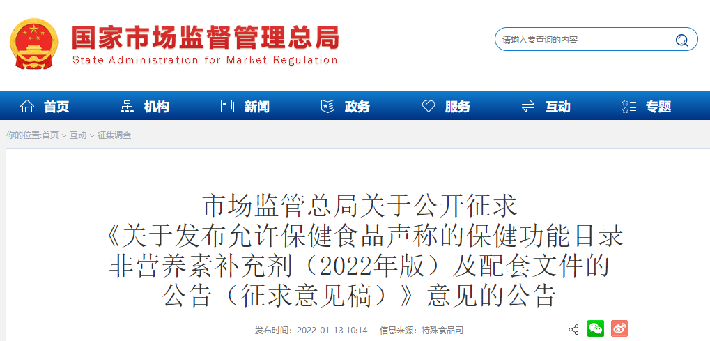市場監(jiān)管總局關(guān)于公開征求《關(guān)于發(fā)布允許保健食品聲稱的保健功能目錄 非營養(yǎng)素